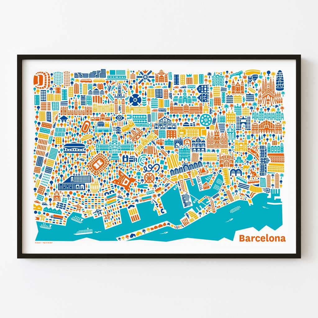 Stadtplan Barcelona Poster im Bilderrahmen: Holzrahmen verfügbar in Eiche, Schwarz oder Weiß, Profil 20 mm.
