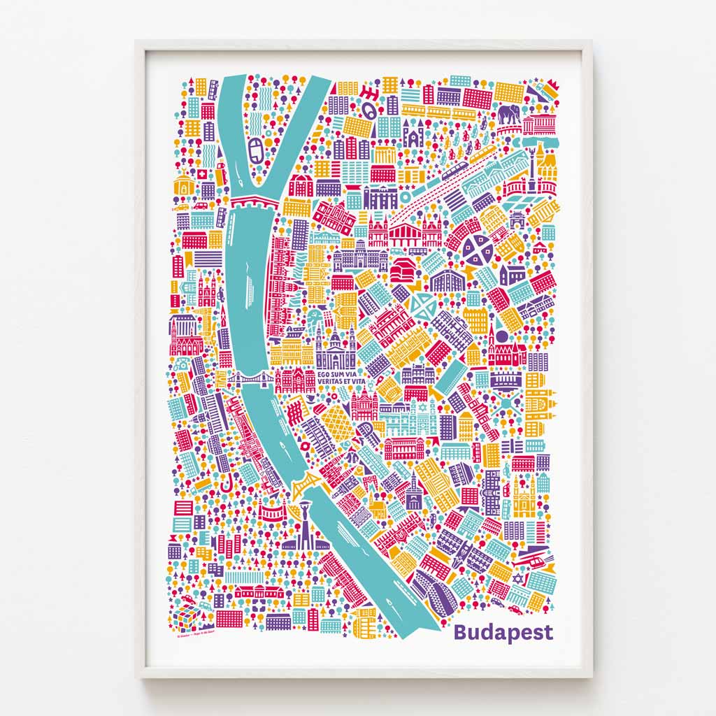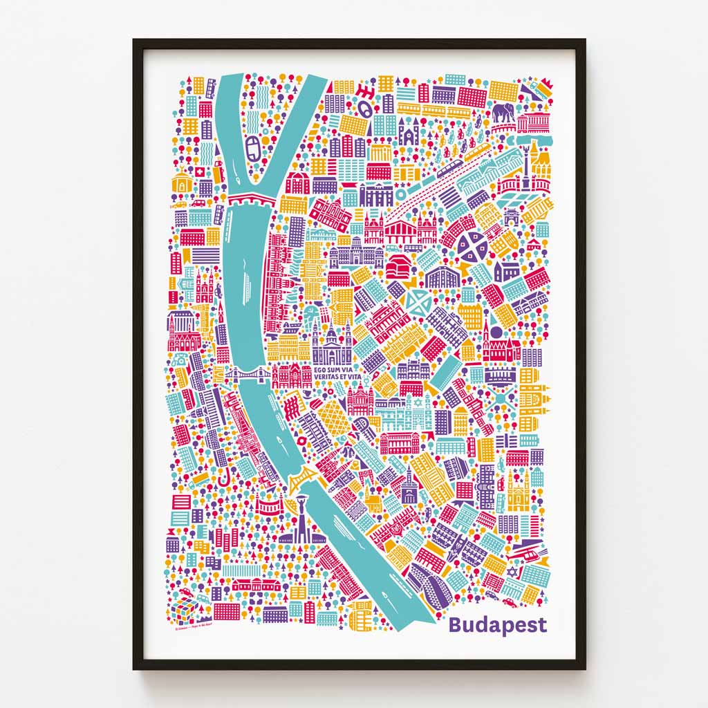 Stadtplan Budapest Poster im Bilderrahmen: Holzrahmen verfügbar in Eiche, Schwarz oder Weiß, Profil 20 mm.