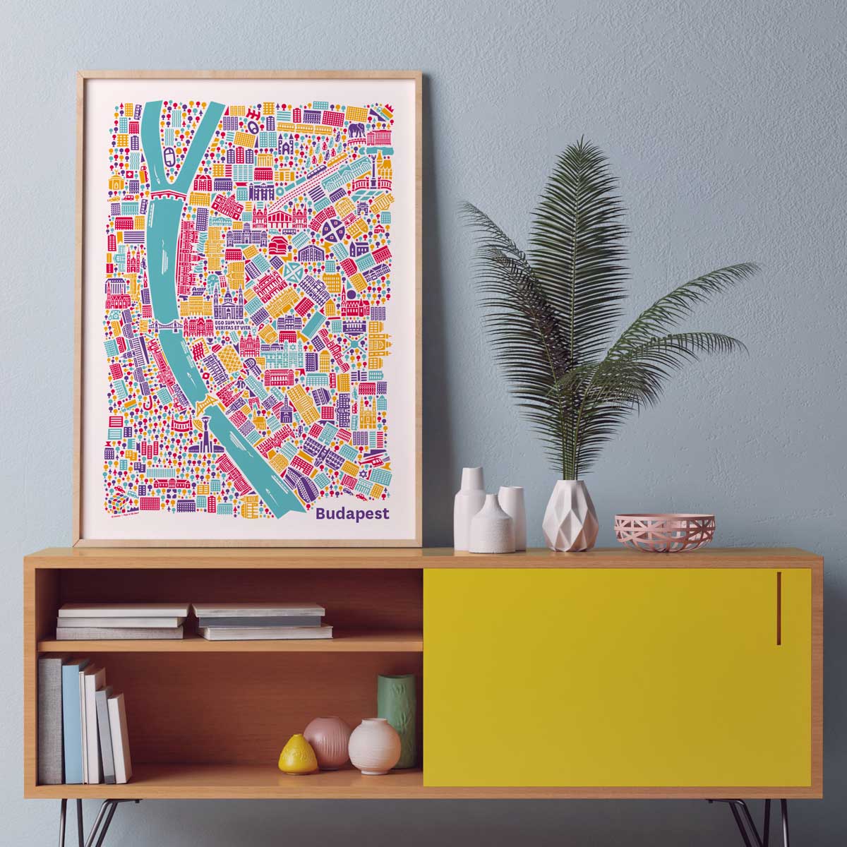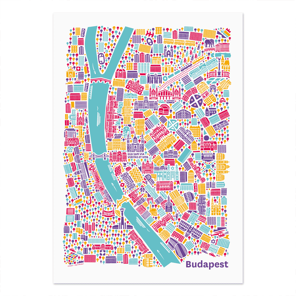 Das Budapest-Poster von Vianina zeigt die bekanntesten Wahrzeichen und Sehenswürdigkeiten der Stadt, darunter den imposanten Burgpalast, die Fischerbastei, das ungarische Parlamentsgebäude, die Matthiaskirche, die St.-Stephans-Basilika, den Heldenplatz, die Große Markthalle, die berühmte Kettenbrücke und das Széchenyi-Thermalbad. Zudem finden sich die Margareteninsel, das Gellértbad, die Andrássy út, die Váci utca, die Synagoge in der Dohánystraße, die Ungarische Nationalgalerie und der Gellértberg auf dem detailverliebten Stadtplan-Poster.