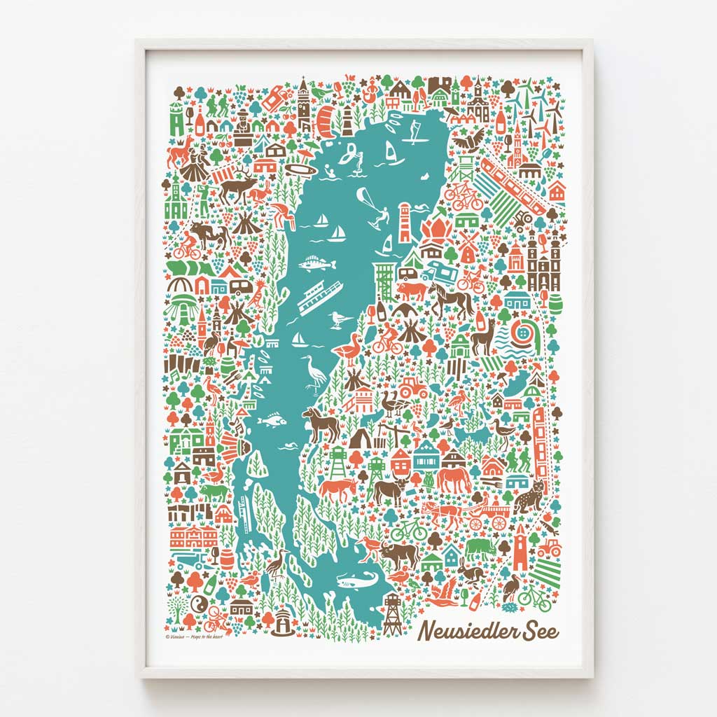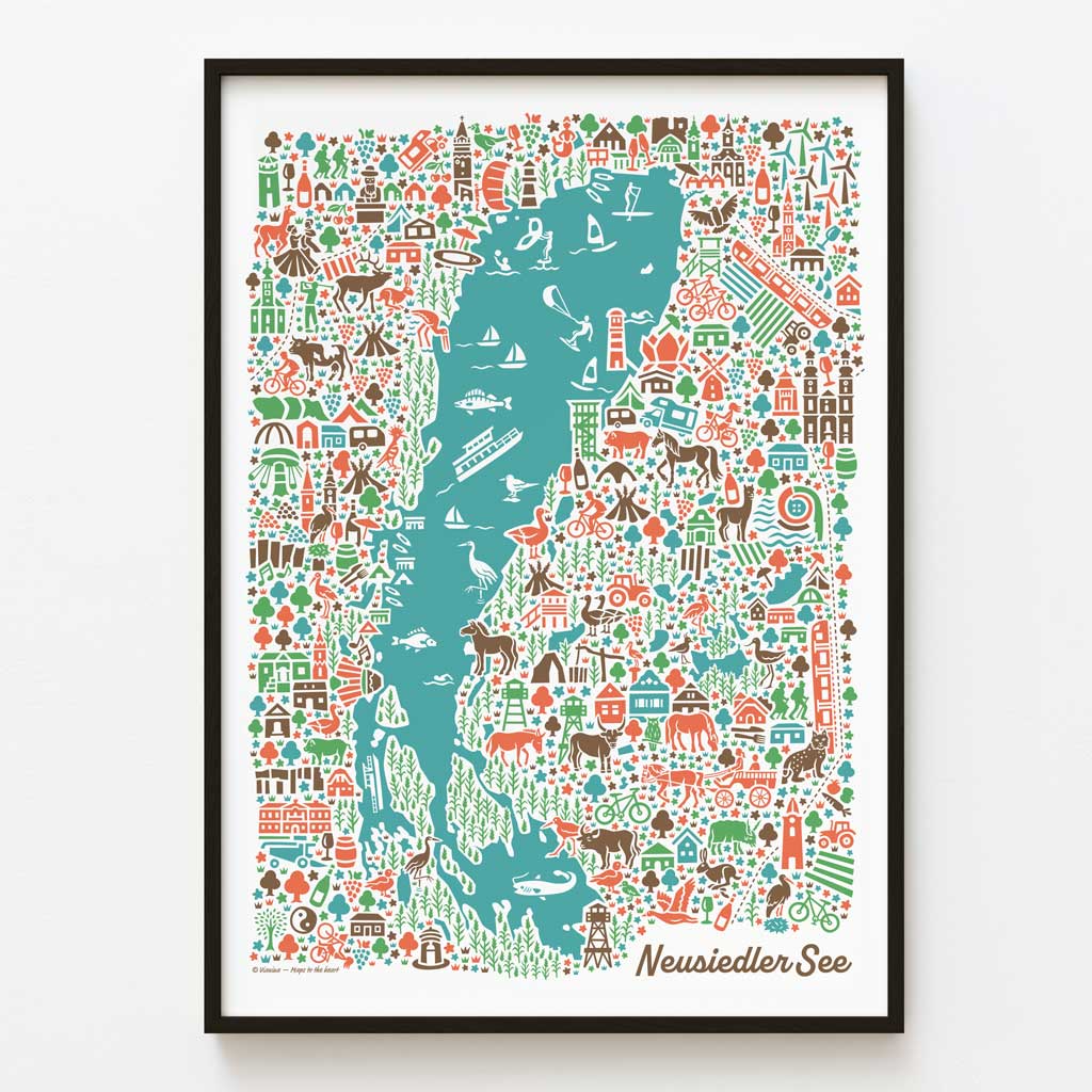Der Neusiedler See ist einer der wenigen Steppenseen Europas mit 300 Sonnentagen im Jahr, beheimatet viele Vogelarten wie den Storch, den Silberreiher, die Graugans und den Bienenfresser und ist Teil des UNESCO-Welterbes. Er ist außerdem Österreichs beliebtestes Surf-, Kite- und Segelrevier. Auch Radfahrer lieben den See – die Radlpause verbringst Du vielleicht in einem der vielen Heurigen bei einem Gläschen burgenländischen Wein? Im Sommer locken der Römersteinbruch St. Mararethen oder die Seefestspiele Mörbisch Kulturhungrige an den österreichisch-ungarischen See. Mit meiner Karte vom Neusiedler See möchte ich der großen Vielfalt an Flora und Fauna, Orten und Aktivitäten ein fröhliches Vianina-Denkmal setzen.