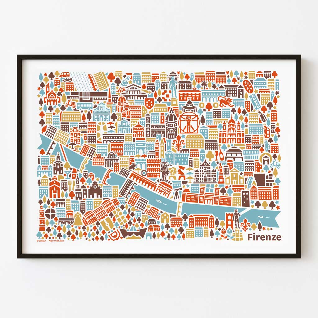 Das gerahmte Poster mit dem Florenz-Motiv enthält unter anderem die Sehenswürdigkeiten Uffizien, Cattedrale Santa Maria del Fiore, Ponte Vecchio, Palazzo Vecchio, Santa Croce, David von Michelangelo, Palazzo Pitti, Galleria dell’Accademia, Mercato Centrale & die Venus von Botticelli.