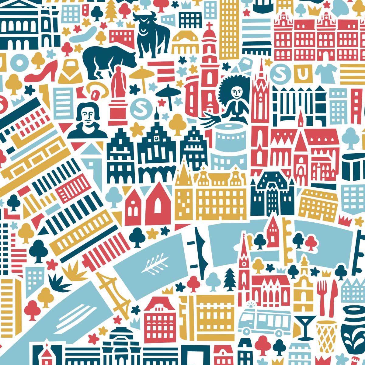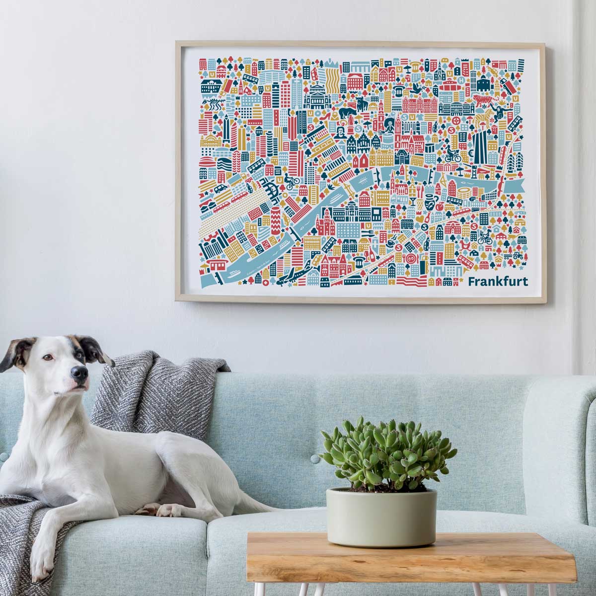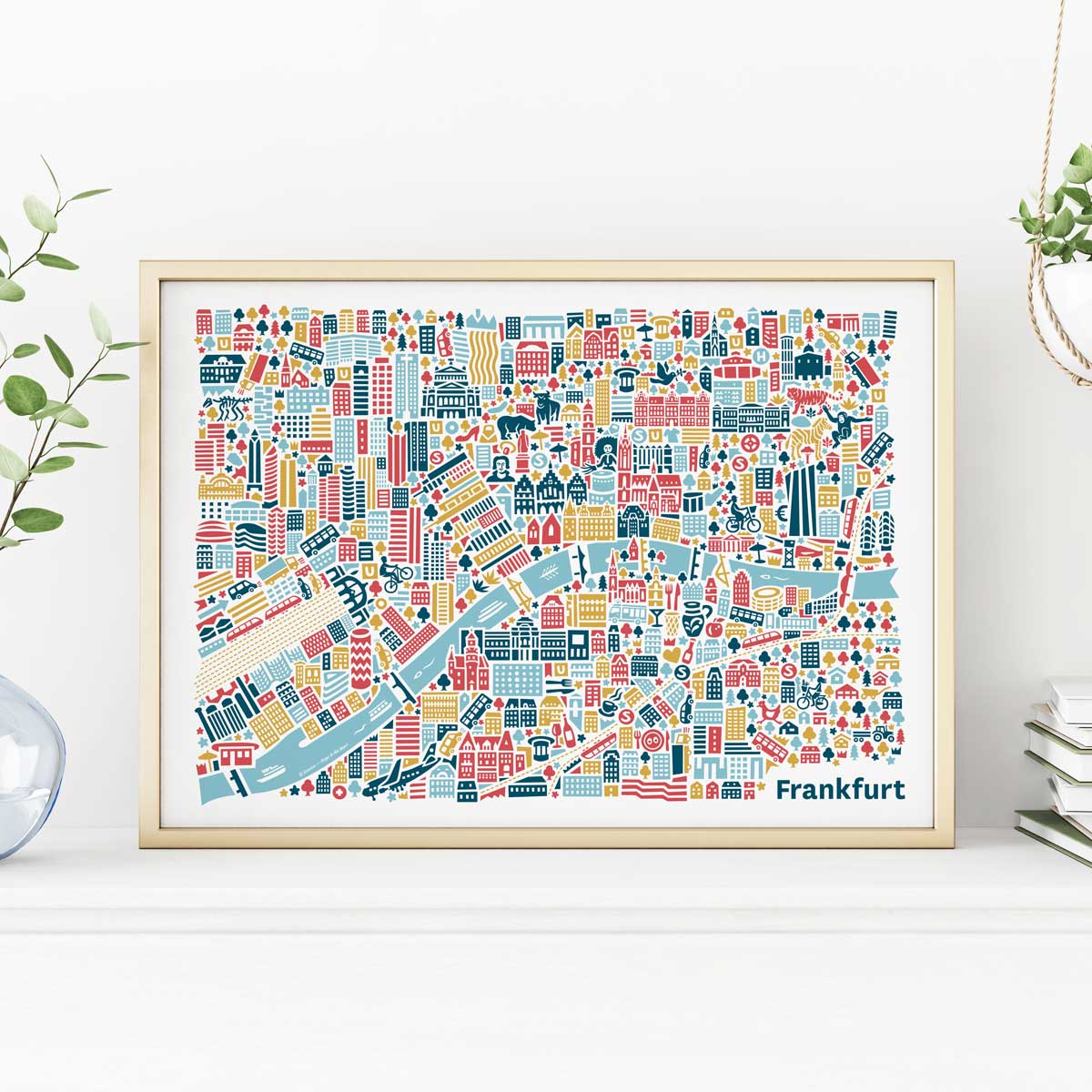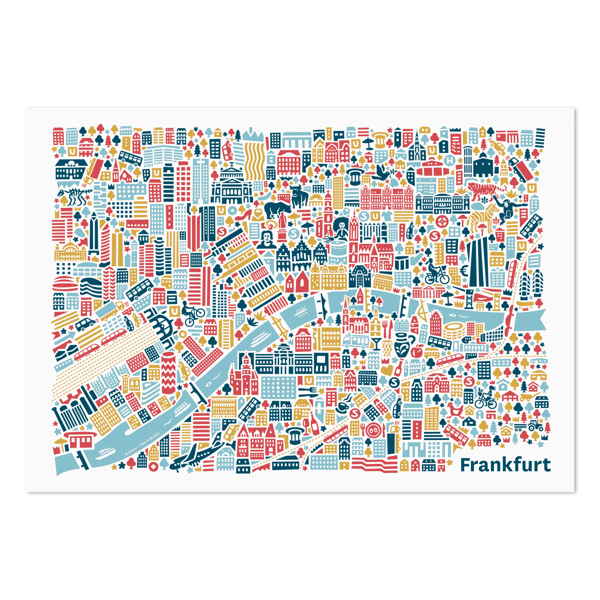 Das Plakat mit dem Frankfurt-Motiv enthält u.a. die Sehenswürdigkeiten Frankfurter Römer und Römerberg, Paulskirche, Frankfurter Skyline, Kaiserdom St. Bartholomäus, Museumsufer am Main, Alte Oper Frankfurt, Sachsenhausen mit Apfelwein und Bembel (Eppelwoi), Goethe, Zoo Frankfurt u.v.m.