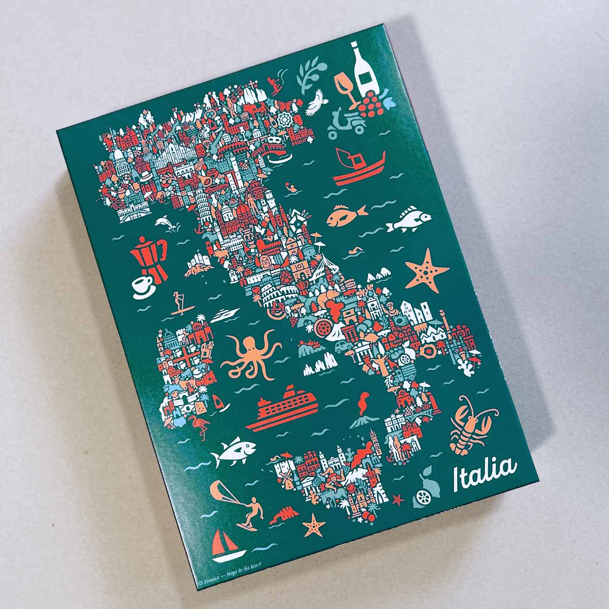 Entdecke Italien in 1000 Teilen. Italien Karte Puzzle mit den Sehenswürdigkeiten Kolosseum, Mailänder Dom, Schiefer Turm von Pisa, Rialtobrücke, Kathedrale von Florenz, Pompeji, Gardasee, Comer See, Insel Elba, Vesuv, Ätna, Sardinien, Sizilien u.v.m.