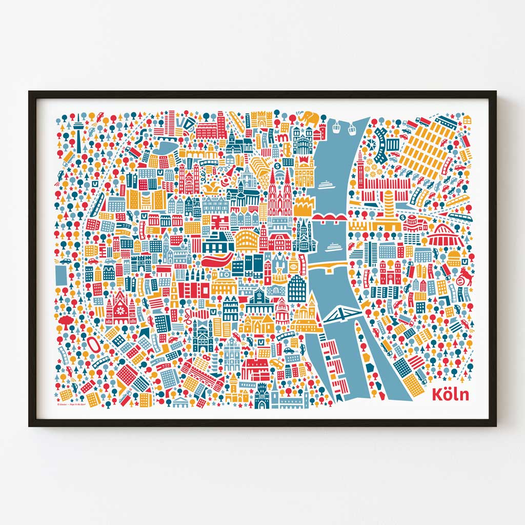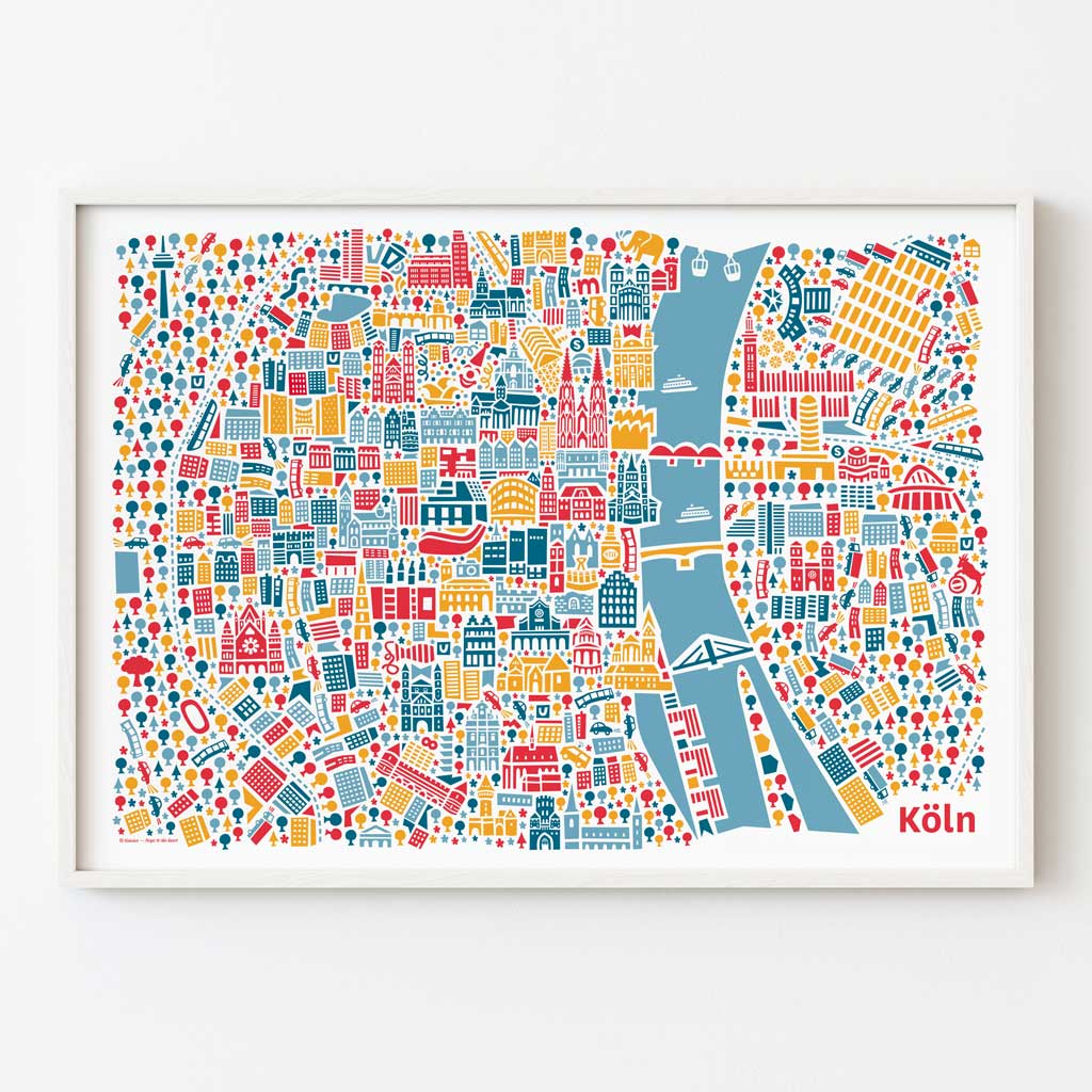 Das gerahmte Poster mit dem Köln-Motiv enthält u.a. die Sehenswürdigkeiten Kölner Dom, Colonius, Museum Ludwig, Weltstadthaus, Kolumba, Kölner Philharmonie, Hohenzollern Brücke, Römisch-Germanisches Museum, Wallraf-Richartz-Museum, Lanxess Arena & Museum Schnütgen.