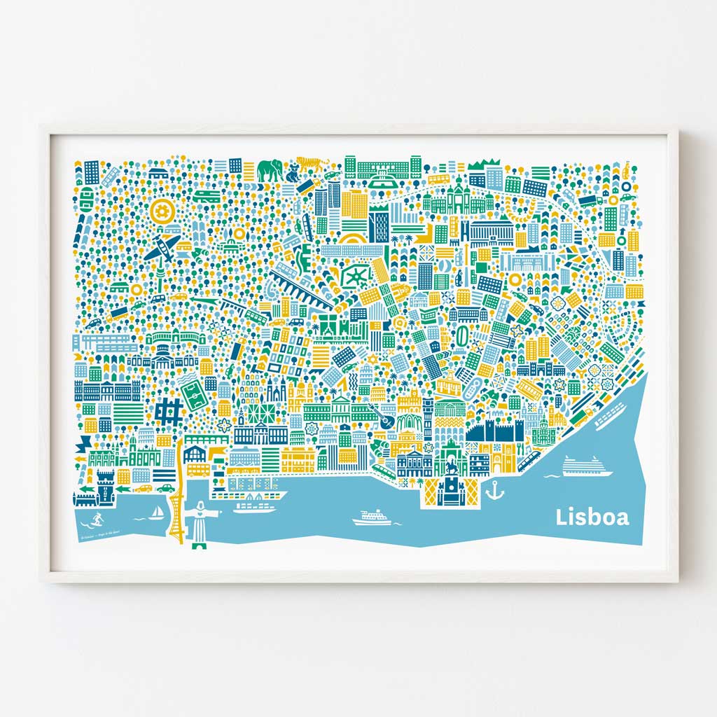 Stadtplan Lissabon Poster im Bilderrahmen: Holzrahmen verfügbar in Eiche, Schwarz oder Weiß, Profil 20 mm.