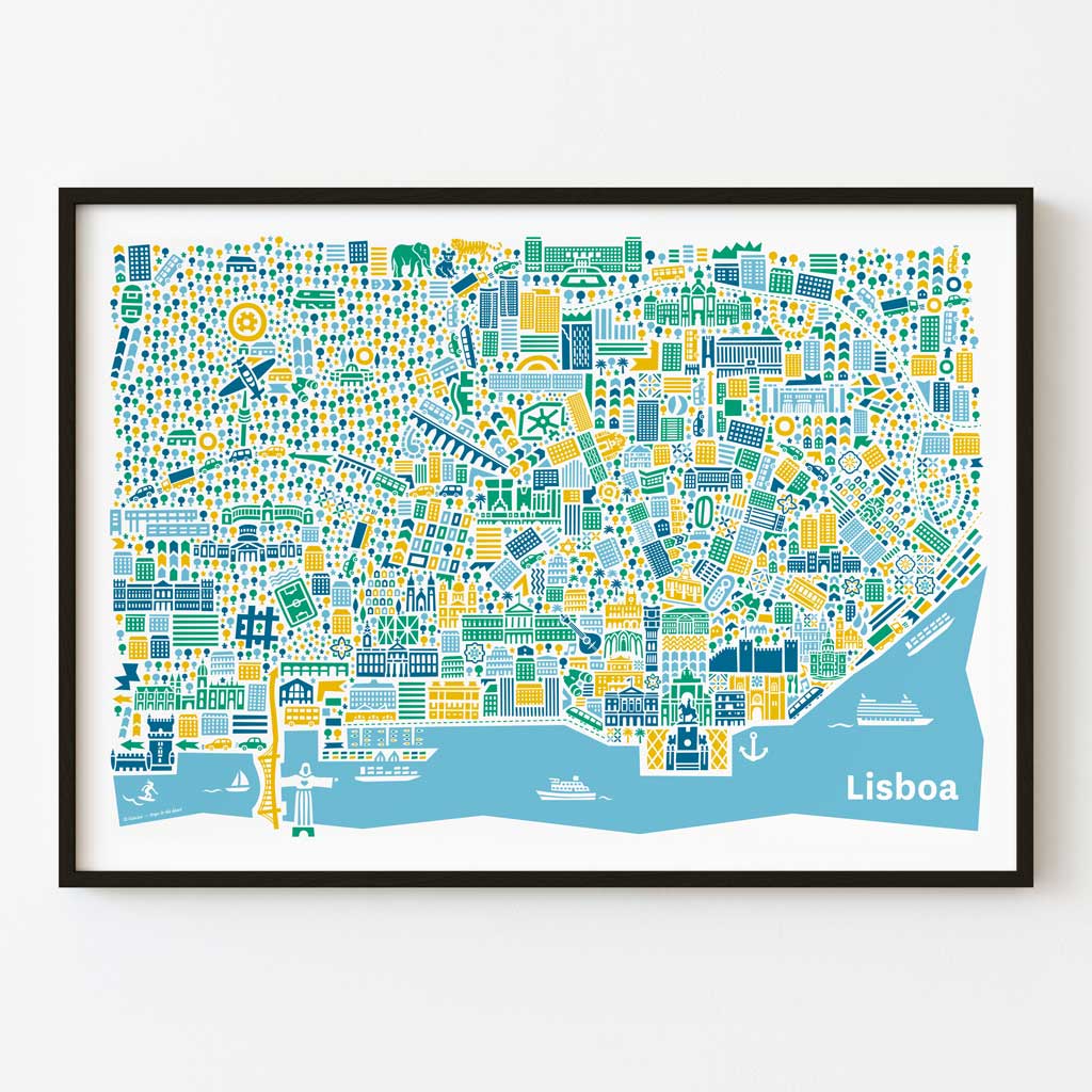 Das gerahmte Poster mit dem Lissabon-Motiv enthält u.a. die Sehenswürdigkeiten Torre de Belém, Mosteiro dos Jerónimos, Castelo de São Jorge, Bairro Alto, Rossio, Praça do Comércio, Elevador de Santa Justa, Ponte 25 de Abril, Cristo Rei, Catedral Sé Patriarcal, Arco da Rua Augusta & Igreja de Santa Engrácia.
