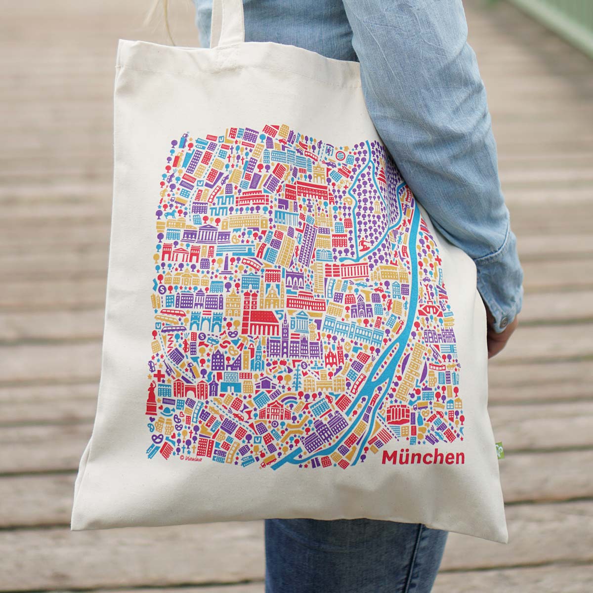 Stadtplan München Stofftasche, 4 farbiger Siebdruck, Größe: 38 x 42, Trageschlaufen 67 cm (kann in der Hand oder über der Schulter getragen werden), Material: kräftige 340 g/qm, 100% Bio-Baumwolle (Organic Canvas), waschbar, hier online kaufen.