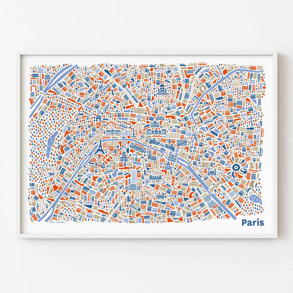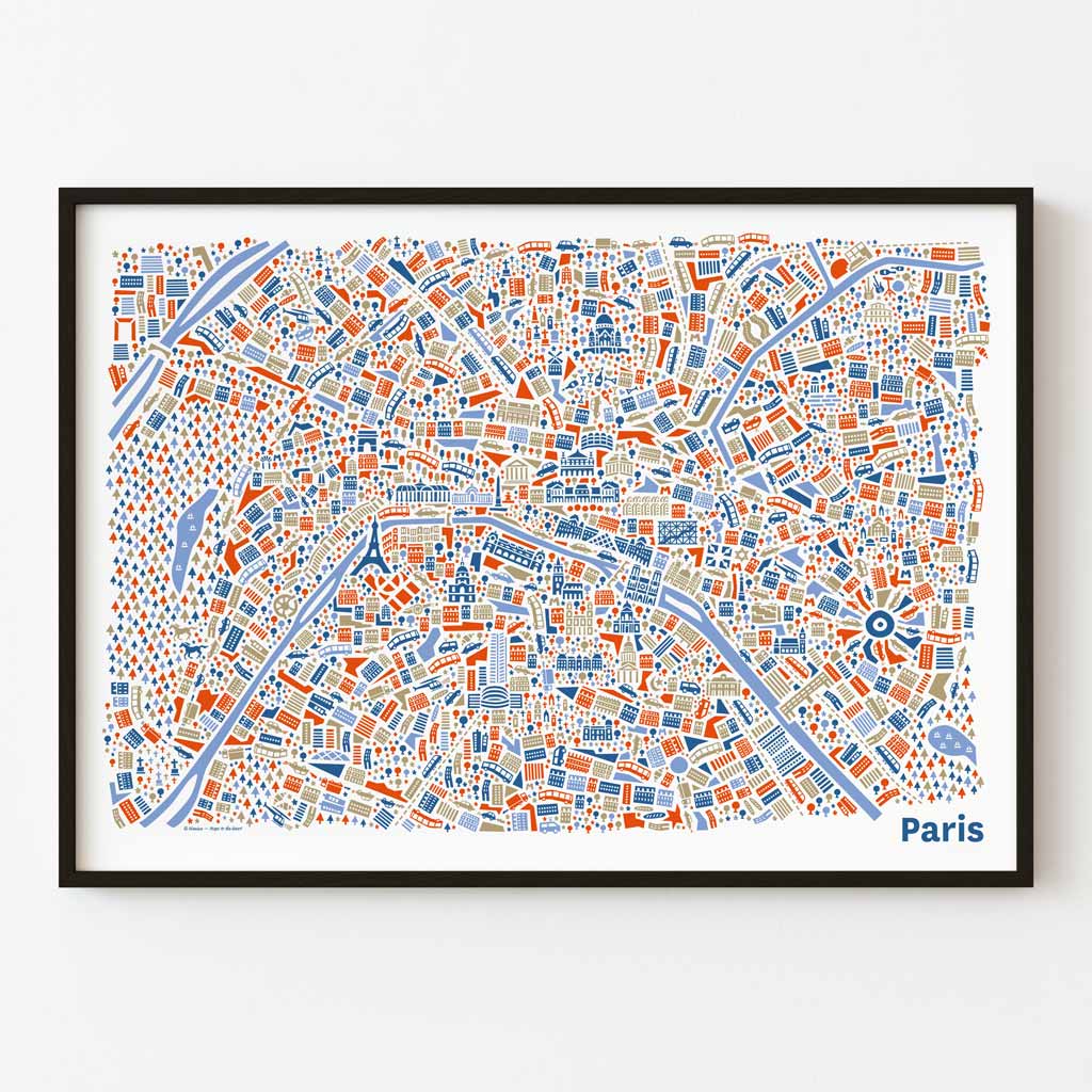 Stadtplan Paris Poster im Bilderrahmen: Holzrahmen verfügbar in Eiche, Schwarz oder Weiß, Profil 20 mm.