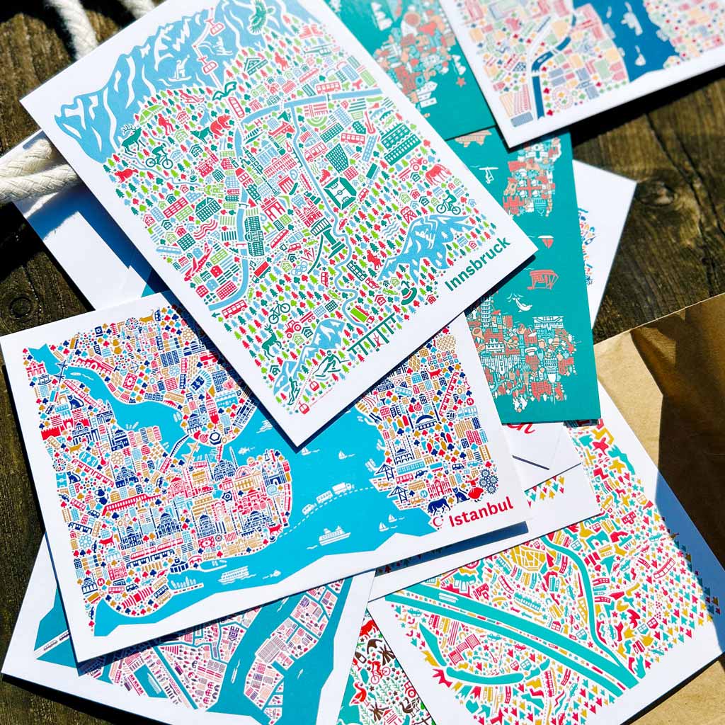 Die Vianina Stadtplan Illustrationen Amsterdam, Barcelona, Berlin, Budapest, Hamburg, Köln, Lissabon, London, New York, München, Paris, Prag, Rom, Salzburg, Sydney, Venedig und Wien, als Postkarten im Set zu 5 oder 10 Stück, freie Motivwahl, ohne Kuverts.