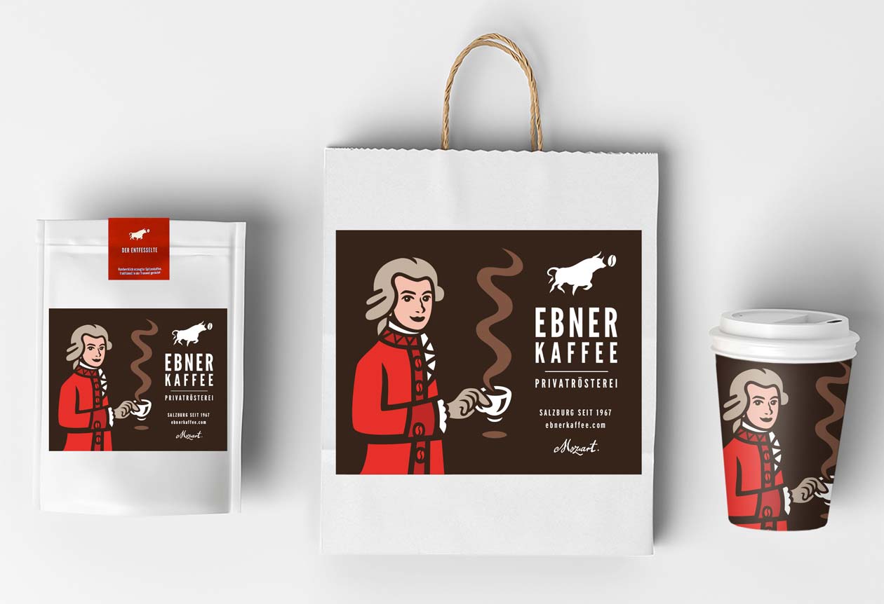 Seit 1967 röstet Ebner Kaffee in Salzburgs ältester durchgehend bestehender Kaffeerösterei hochwertigste Bohnen aus aller Welt und komponieren so feinste Kaffeekreationen. Frau Ebner schrieb mir, weil sie meine Postkarte mit Mozart entdeckt hatte und diesen sehr gerne für Ihre Kaffeeverpackungen nutzen wollte.