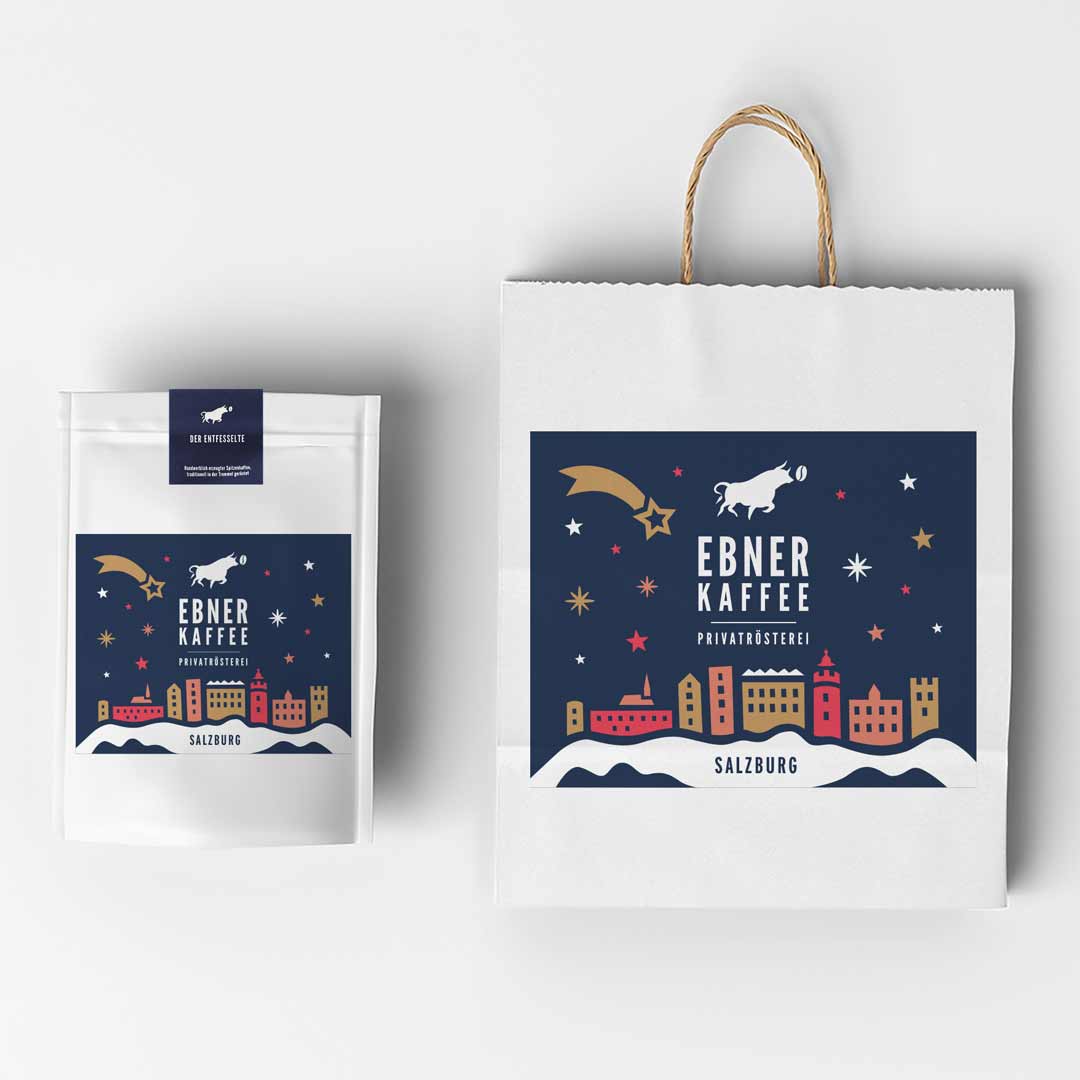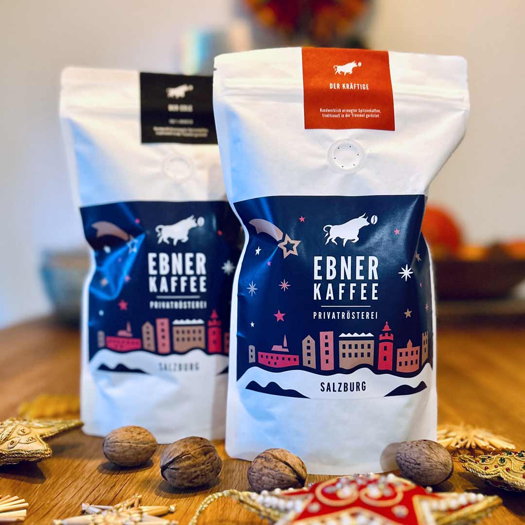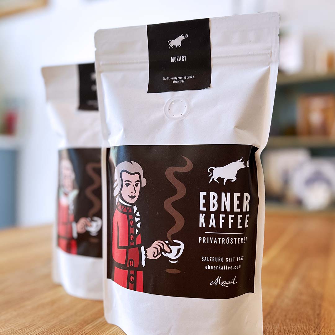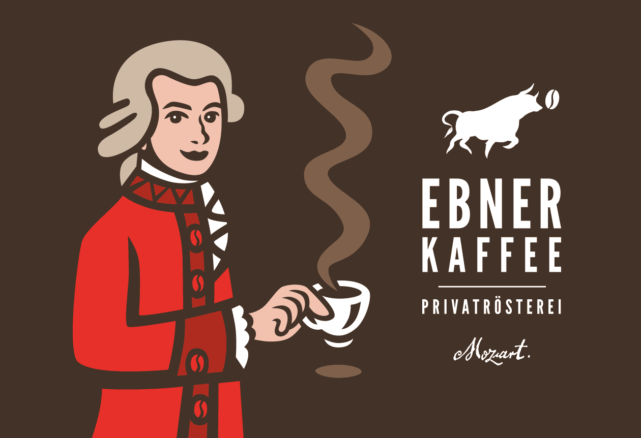 Seit 1967 röstet Ebner Kaffee in Salzburgs ältester durchgehend bestehender Kaffeerösterei hochwertigste Bohnen aus aller Welt und komponieren so feinste Kaffeekreationen. Frau Ebner schrieb mir, weil sie meine Postkarte mit Mozart entdeckt hatte und diesen sehr gerne für Ihre Kaffeeverpackungen nutzen wollte. Dafür habe ich der Rösterei einen Mozart mit Kaffeeheferl und Knöpfen aus Kaffeebohnen illustriert.