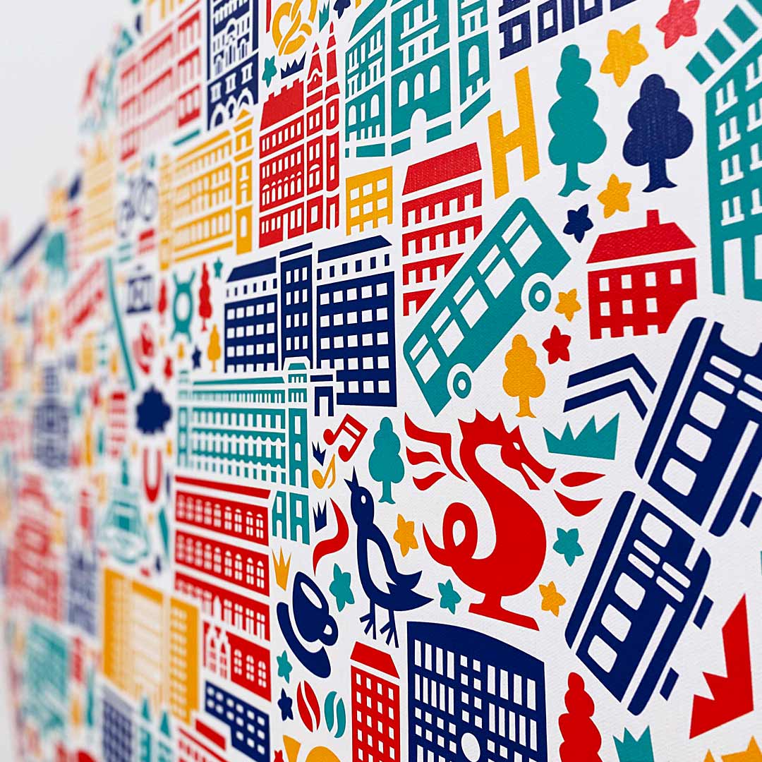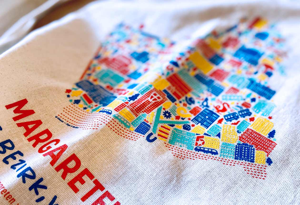 Ich hab mich riesig über diesen Auftrag gefreut, weil mich eine ganz besondere Zeit mit dem 5. Bezirk verbindet. Meine ersten vier Jahre in Wien habe ich dort in einem Grafikbüro gearbeitet. Mit drauf sind alle Highlights aus Margarten wie der Margaretenplatz mit dem Margaretenhof, das Vorwärts-Gebäude, Gemeindebauten wie der Reumannhof und der Metzleinstaler Hof und das Filmcasino. Dieser Bezirk gilt als Arbeiterbezirk und hat rund 54.000 Einwohner.
