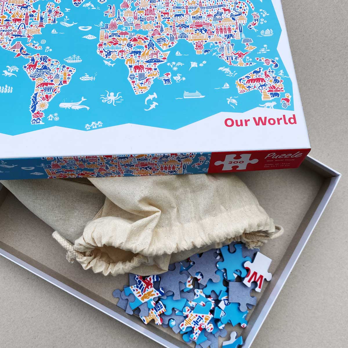 Das Weltkarte Puzzle hat die Maße 480×340 mm, 200 Teile, Karton Maße 290×230×33 mm, Puzzleteile aus Puzzlepappe, hier online kaufen.