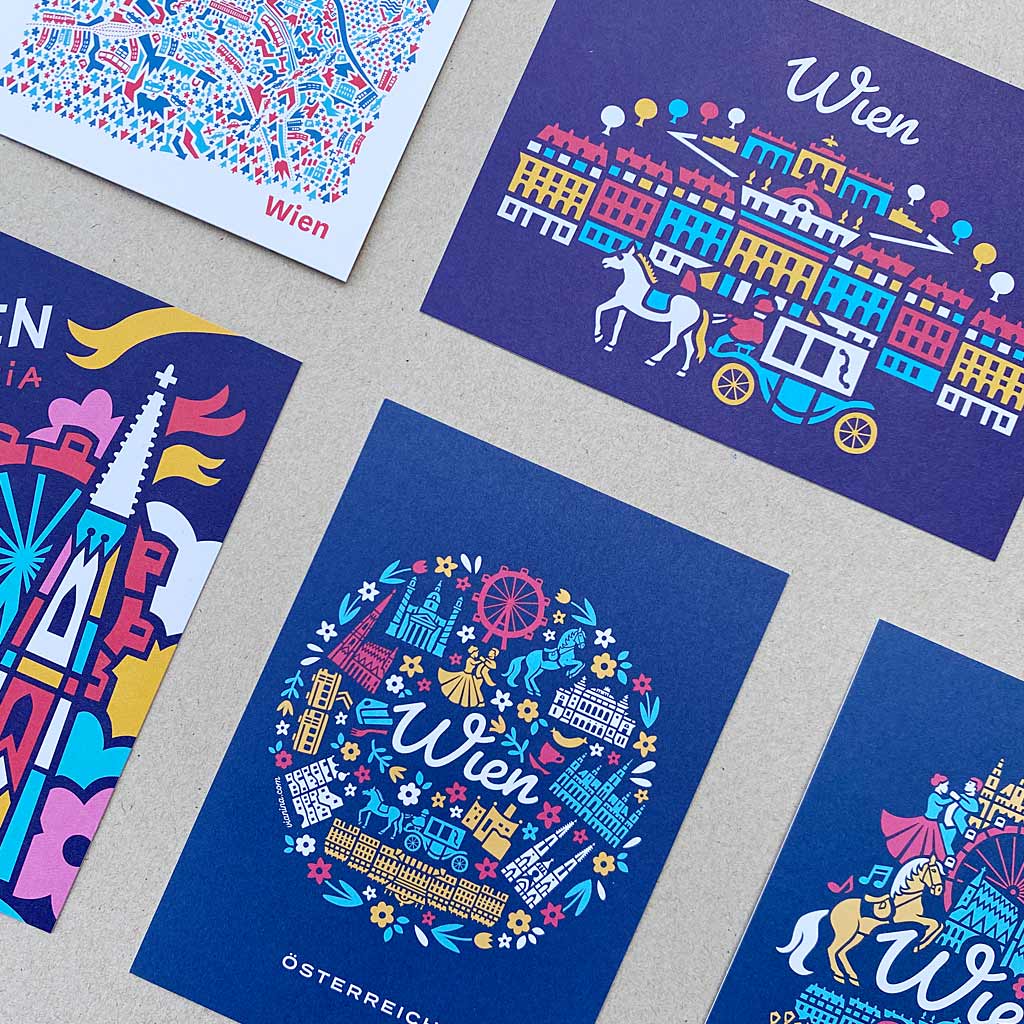 5 Postkarten-Set. Im Paket enthalten ist 2x Wien Stadtplan-Karte, 1x Stephansdom & Riesenrad, 1x Schloss Schönbrunn und 1x Sachertorte.