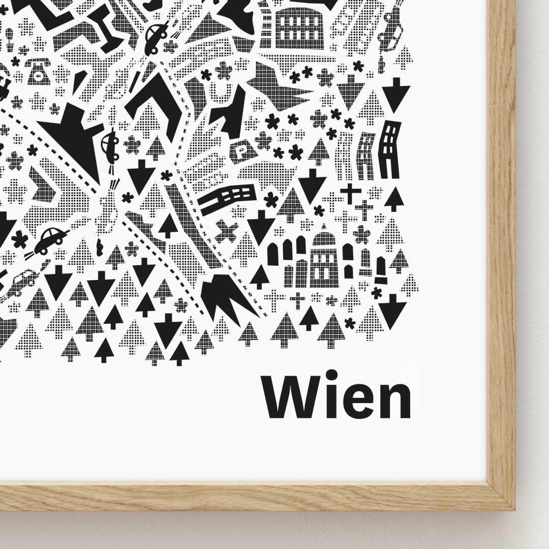 Der Siebdruck mit dem Wien-Motiv enthält unter anderem die Sehenswürdigkeiten Riesenrad, Stephansdom, Schloss Schönbrunn, Schloss Belvedere und die Hofburg.